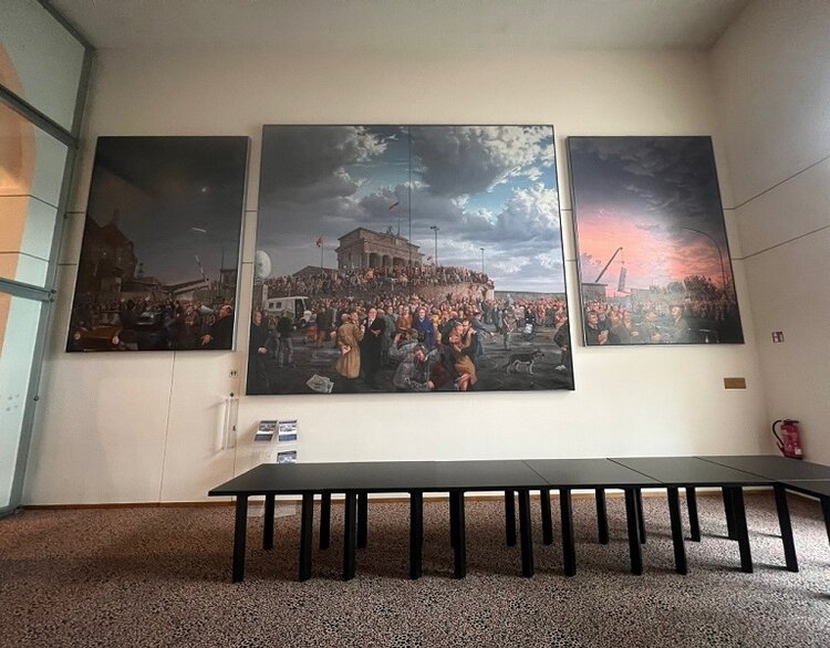 Anschließend gingen wir in die Cafeteria, auch „Casino“ genannt, wo ein dreiteiliges riesiges Bild des Künstlers M. Koeppel hängt. Dieses Bild stellt den Berliner Mauerfall dar. Der Maler hat sich selbst und seine Frau auch darauf dargestellt. Viele Politiker*innen dieser Zeit sind auf dem Gemälde zu finden, wie sie Interviews geben oder sich mit anderen unterhalten. Eastereggs verstecken sich auch in diesem Bild. Zum Beispiel von international bekannten Marken oder von berühmten Zeitungen, die einander gegenüberstehen.