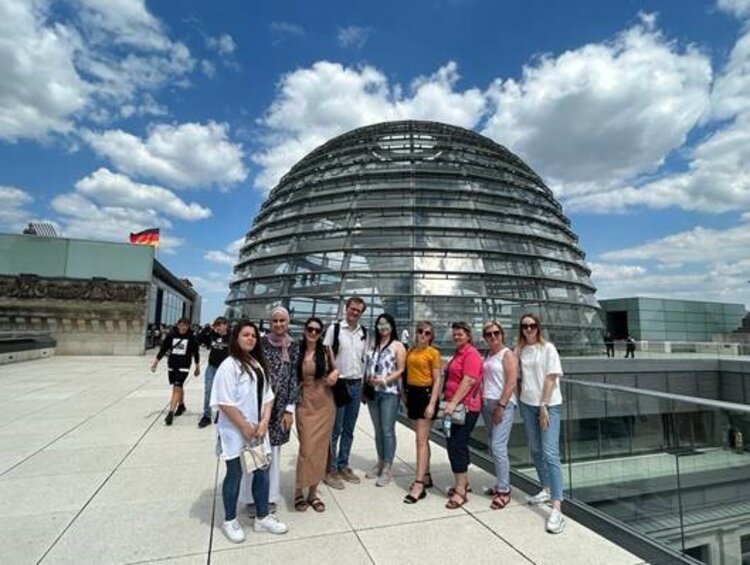 Anschließend besuchte die Gruppe die Gedenkstätten, die sich unweit des Tiergartens befinden, mit dem Holocaust-Mahnmal. Nach kurzer Pause ging die Exkursion am Brandenburger Tor vorbei, bis auf die Kuppel des Reichstagsgebäudes. Nach dem geplanten letzten Punkt des Ausflugs hatte die Gruppe noch Lust auf ein gemeinsames Essen in einem Restaurant.