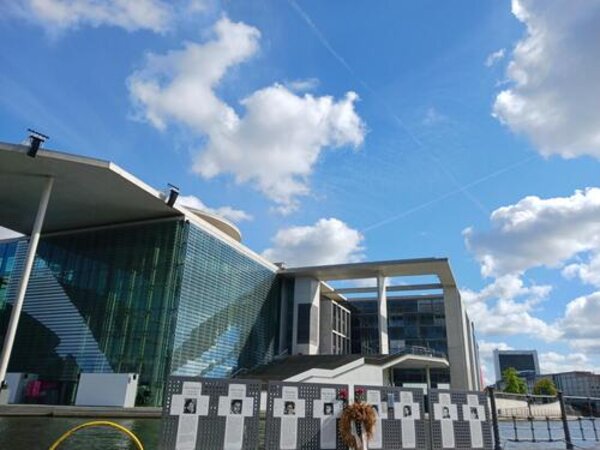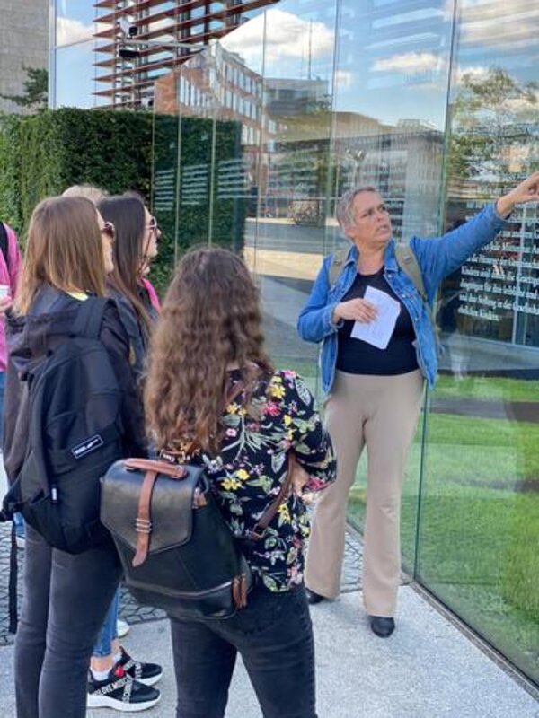 Bei einer abschließenden Exkursion in Form eines Spaziergangs von der Friedrichstraße zum Potsdamer Platz haben wir vieles entdecken können, was im Kurs thematisiert worden war und somit einen unmittelbaren Bezug zu den Prüfungsfragen hatte. Der Tränenpalast als Zeugnis der deutschen Teilung ist ein Beispiel dafür oder das Denkmal "Züge ins Leben. Züge in den Tod", das an die Transporte jüdischer Kinder von Deutschland nach Großbritannien in den Jahren nach den Pogromen im Jahr 1938 erinnert. Auch das Kunstwerk "Grundgesetz 49" am Jakob-Kayser-Haus, die Weißen Kreuze am Spreeufer und die Erinnerungsorte für die Opfer des Nationalsozialismus haben wir besucht.