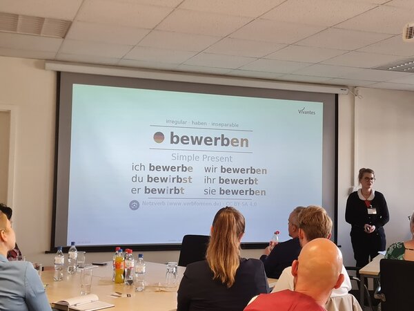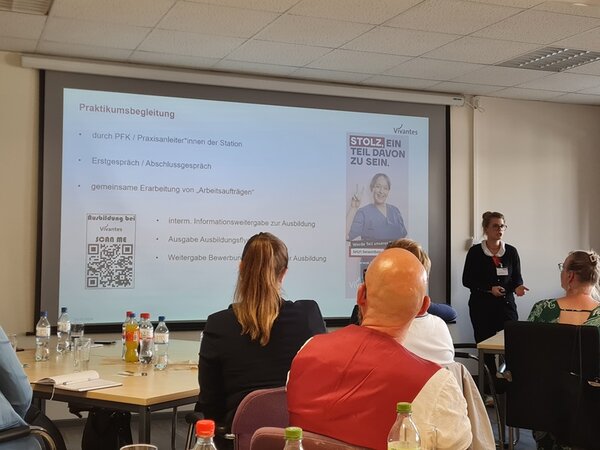 Im anschließenden Praxisinput gab Kristin Hannuschka vom Vivantes Humboldt-Klinikum einen Einblick, wie die Vivantes Kliniken die Praktika in den unterschiedlichsten Bereichen der Klinik vorbereiten und durchführen. Beeindruckend war, dass hier Praktikumsphasen mit einer hohen Anzahl an Schulpraktikant*innen gleichzeitig bewältigt werden. Wie das gelingt, wurde den Anwesenden ausführlich geschildert. Ein besonderes Augenmerk wird hier auf die Durchführung und dem anschließenden Auswertungsgespräch gelegt.