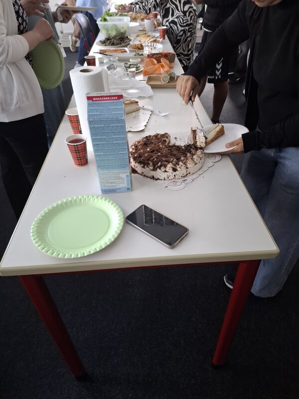 Als er dann aus seiner Pause wieder in den Klassenraum kam, brachte Herrn Kurp der gesamte Kurs ein lautstarkes Ständchen und jubelte ihm zu! Zudem hatte die Klasse ein großzügiges Buffet mitgebracht. Es gab die verschiedensten Gerichte aus allen Ecken der Welt und genauso viele unterschiedliche Kuchen! Trotz tatkräftiger Unterstützung von Kolleg*innen der Euro-Schulen Berlin war es nicht möglich, von allem zu probieren!