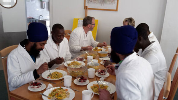 In den Euro-Schulen Bitterfeld-Wolfen findet einmal wöchentlich eine Qualifizierung für geflüchtete Menschen im HoGa-Bereich statt. Eberhard Rohde, Chef der Wolfener Übungsküche, ist gleichzeitig Anleiter, Küchenchef und Ansprechpartner für die aktuell fünf Teilnehmer in seiner Küche. Er ist überrascht vom Fleiß und Engagement seiner Schützlinge: „Die Jungs sind pünktlich und haben Spaß an der Arbeit. Und darüber hinaus schmeckt das Essen. Denn die Jungs können kochen“, erklärt er.