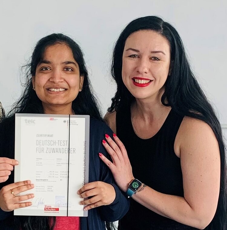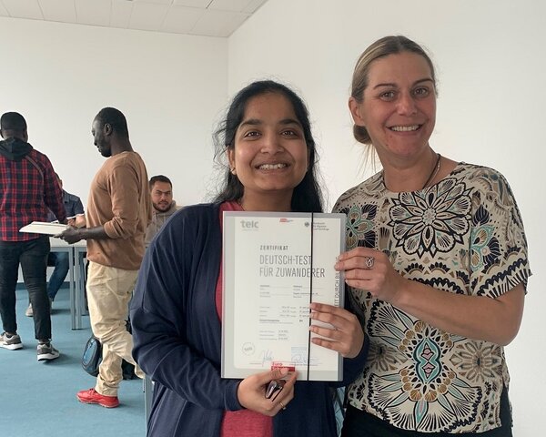 Während noch die letzten Stunden des Orientierungskurses abgehalten wurden und auch schon der Test „Leben in Deutschland“ auf dem Plan stand, kamen die Prüfungsergebnisse. Voller Stolz haben die Teilnehmer*innen ihre Zertifikate in Empfang genommen und sind ein paar Tage später motiviert in ihre letzte Prüfung gestartet.