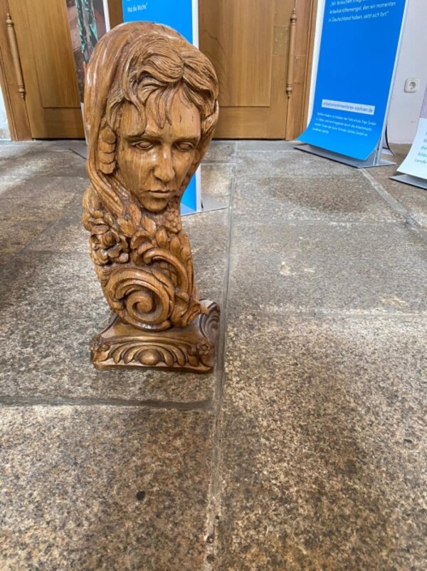 Ein Teilnehmer aus dem Projekt "Arbeitsmarktmentor*innen Landkreis Görlitz" bekam die Gelegenheit, einige seiner Exponate (Holzschnitzereien) auszustellen. Er konnte sich mit Hilfe unserer "AMMs" im vergangenen Jahr selbstständig machen und nutzte beim Stehcafé, zu dem Pfarrerin Dörte Paul im Anschluss an den Gottesdienst einlud, die Gelegenheit mit Gästen ins Gespräch zu kommen.
