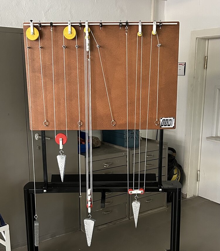 Die Wand ist mit festen und losen Rollen sowie einem Flaschenzug ausgestattet und ermöglicht es den Schüler*innen, mechanische Prinzipien praxisnah zu erforschen.