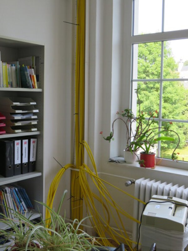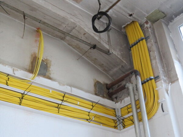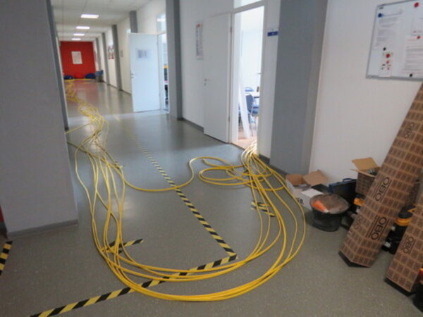 Dabei stieß man auch auf die eine oder andere (meist nicht so positive) Überraschung, die neue Herausforderungen nach sich zog. Bis jetzt sind insgesamt 8,5 km Kabel verlegt worden. Auch der Server musste in einen neuen Raum umziehen. Trotz hohem Einsatz der Firmen war es leider nicht möglich, die Baumaßnahmen vor Beginn des neuen Schuljahres fertigzustellen.