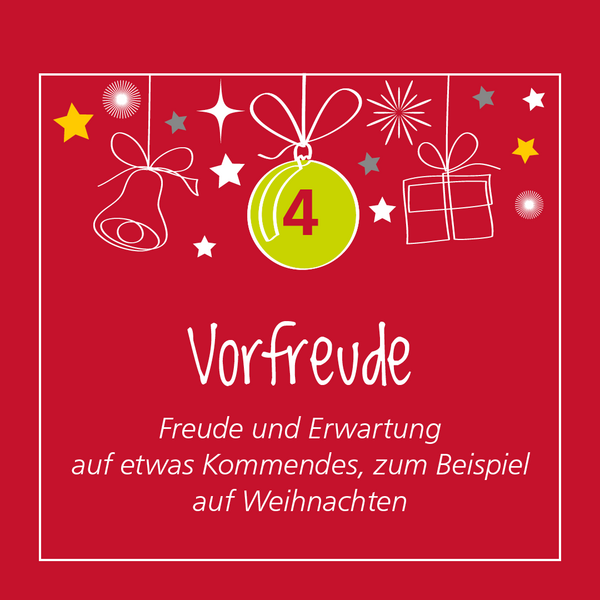 Himmelhochjauchzend, Rauschgoldengel und Honigkuchenpferd – zur Weihnachtszeit hat die deutsche Sprache einen ganz besonderen Zauber. Um diese winterlichen Weihnachtswörter auch den Deutschlernenden näherzubringen, haben wir uns etwas Besonderes ausgedacht: In unserem Adventskalender auf Instagram und Facebook erklären wir 24 Tage lang die schönsten deutschen Weihnachtswörter. Zum Speichern, Lernen und auf der Weihnachtsfeier ausprobieren.