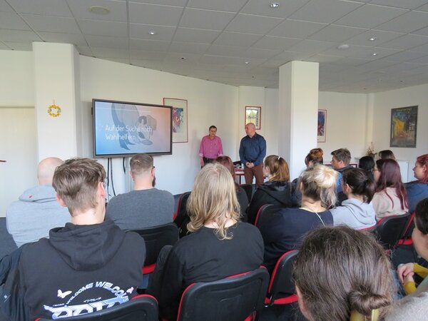 In Abstimmung mit dem Oberbürgermeister der Stadt hatten wir im Rahmen unseres Demokratieförderprojekts den Hauptamtsleiter, Herrn Gleißberg, sowie den Vorsitzenden des Wahlausschusses, Herrn Hölperl, zu Gast. Gemeinsam informierten sie unsere Schüler*innen in der Sozialassistenten- und Erzieherausbildung, aber auch unsere Migrant*innen in der Alphabetisierung zum Superwahljahr 2024 über die Prozesse und Möglichkeiten in einer Demokratie.