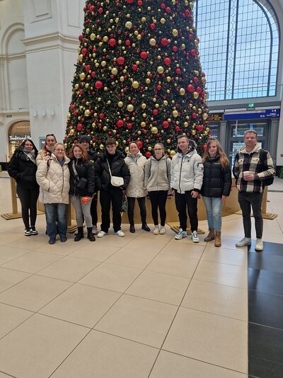 Am 13.12.2023 trafen sich alle Verkäufer*innen-Klassen zur gemeinsamen Jahresabschlussfahrt nach Dresden. Nach einem gemeinsamen Frühstück stand eine Betriebsbesichtigung bei Globetrotter in der Prager Straße auf dem Programm.