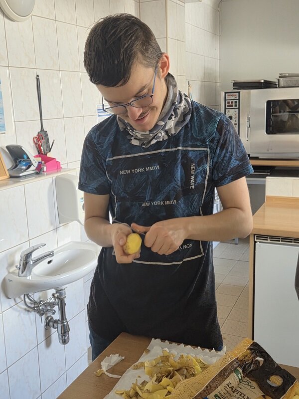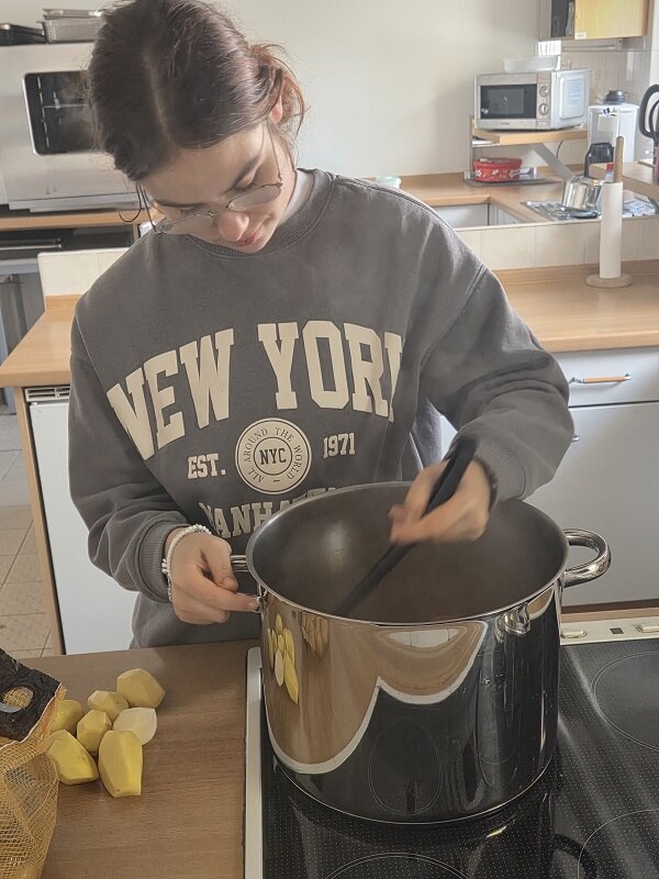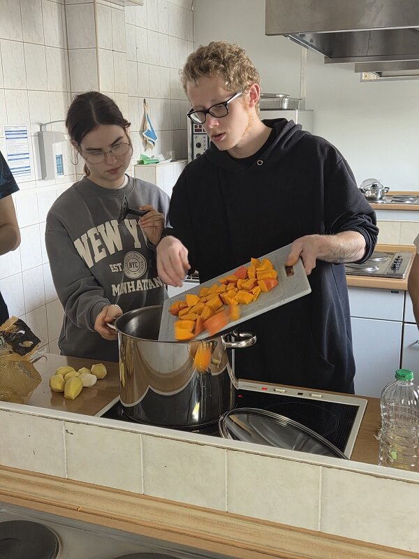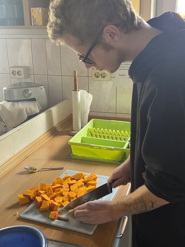 Wir schälten die Kartoffeln, putzten die Karotten und hackten die Zwiebeln und den Knoblauch. Alles wanderte in einen großen Topf, wurde ordentlich angebraten und später mit Gemüsebrühe übergossen. Wir schauten immer wieder neugierig in den Topf, um zu sehen, ob unsere Kürbissuppe vielleicht schon fertig ist, weil wir so einen großen Appetit hatten und natürlich auch ordentlich Hunger.