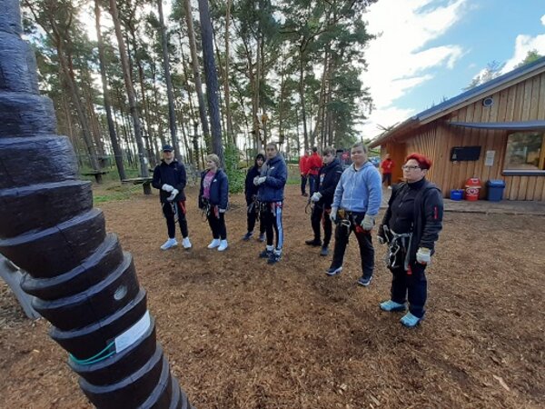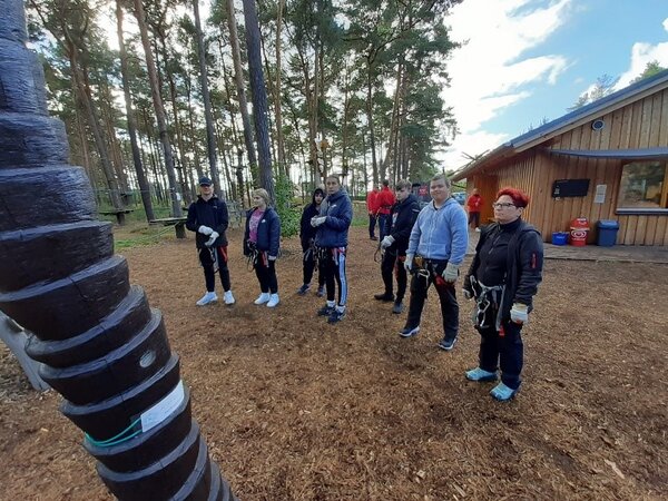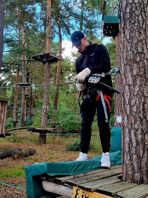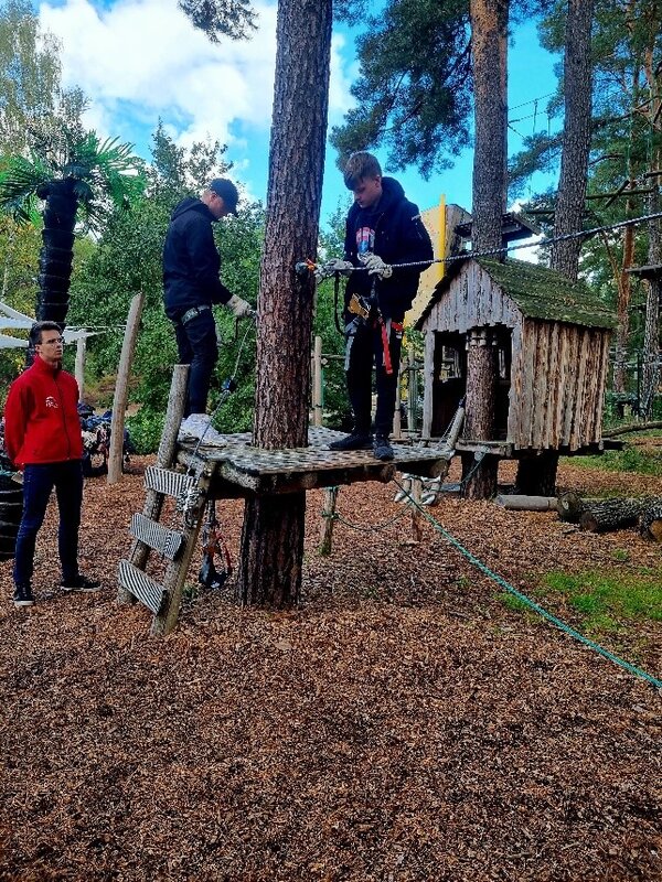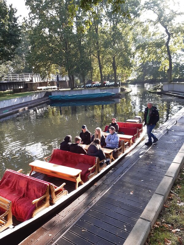 Am Donnerstag starteten wir nach dem Frühstück in Richtung Kletterwald. Vom Parkplatz liefen wir etwa eine Viertelstunde zum Kahnanleger, wo uns der Fährmann vom Verein „Flottes Rudel“ in Empfang nahm. Es folgten entspannte anderhalb Stunden mit drei Schleusendurchfahrten und vielen interessanten und lustigen Informationen über den Spreewald. Nach der Mittagspause besuchten wir den Kletterwald Lübben. Hier gab es zu Beginn eine Belehrung über die Nutzung der verschiedenen Parcours. Nach dem Anlegen des Sicherheitsgeschirres erkletterte jede*r von uns einen Probepcours. Danach wurde es ernst. Die Reihenfolge der verschiedenen Höhen und Schwierigkeitsgraden (Einteilung von Ameise 1m bis Milan 11m) sollte dabei unbedingt eingehalten werden, da viel Kraft und Geschicklichkeit gebraucht wird. In der Jugendherberge erwartete uns ein Grillfest - genau das richtige nach einem anstrengenden Kletterabenteuer. Mit Spielen am Lagerfeuer beendeten wir den Tag.