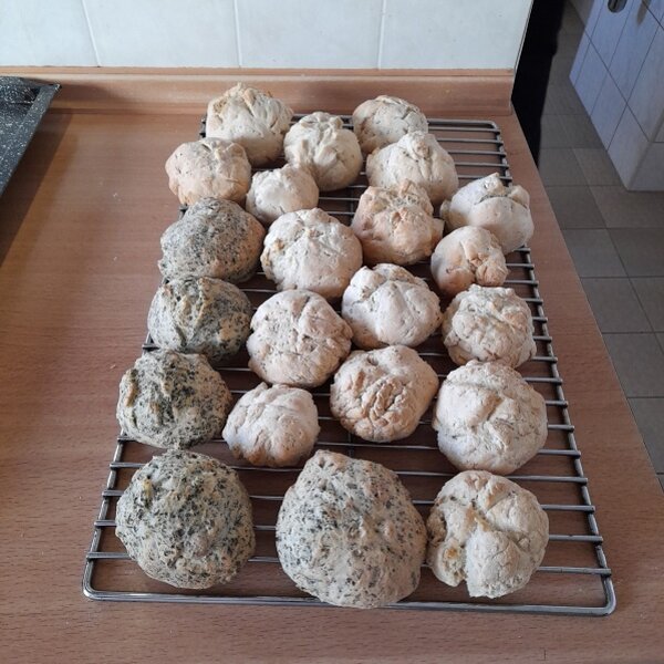 Während die Suppe köchelte, haben wir Dinkelbrötchen gebacken. Die einzelnen Teige verfeinerten wir mit Kräutern, Sesam und Leinsamen sowie Röstzwiebeln.