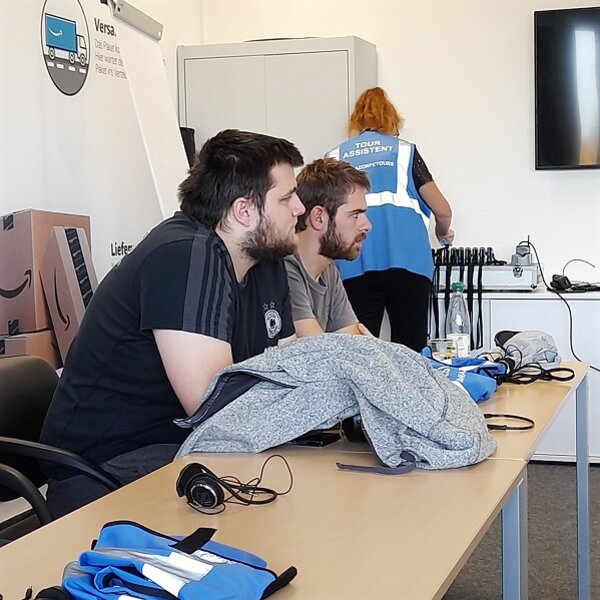 Unser Tourguide Katrin zeigte uns ein YouTube-Video über Amazon Deutschland und nach einer kurzen Belehrung verteilte sie an jeden Teilnehmenden eine Besuchercard, Tour-Westen und ein Headset. Die Amazon-Halle ist in drei verschiedene Zonen aufgeteilt.