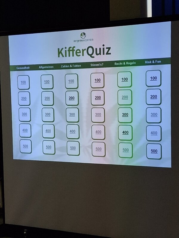- Ein Quiz zum Thema Kiffen. Hier wurden Punkte verteilt. Maximal konnte man ca. 9.000 Punkte erreichen. Die Besten erreichten ca. 4.600 Punkte.
