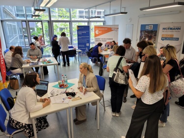 An der Messe nahmen 20 Unternehmen und Institutionen aus verschiedenen Branchen und Bereichen teil. Nach einer kurzen Eröffnung konnte der Arbeitgeberservice der Agentur für Arbeit und des Jobcenters wichtige Hinweise zu Förderinstrumenten und Eingliederungsprozessen geben und stand auch während der Veranstaltung als Ansprechpartner zur Verfügung. Anschließend gaben die Projektteilnehmerin Olena Skurlatova und Katarina Celykina, Teilnehmerin im Integrationskurs, einen interessanten Einblick in das Bildungs- und Qualifikationssystem der Ukraine. Beide beeindruckten die Anwesenden sowohl mit ihrem Vortrag als auch mit ihren bereits sehr guten Sprachkenntnissen. Im Rahmen der Messe war dann Gelegenheit zum Austausch und zu Gesprächen zwischen den beteiligten Unternehmen und den zugewanderten Fachkräften. Kontakte und Lebensläufe wurden ausgetauscht und erste individuelle Gesprächstermine vereinbart.