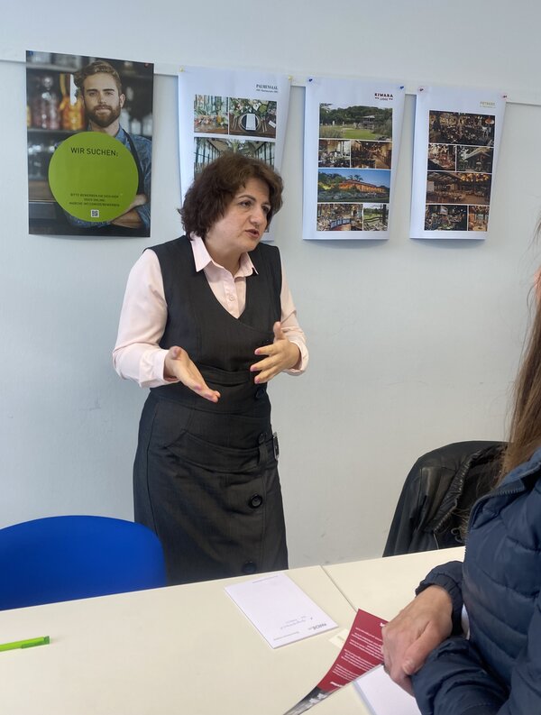 Dabei waren vielfältige Branchenvertreter*innen z. B. aus der Gastronomie, technischen und medizinischen Berufen bis hin zum pädagogischen Bereich. Im kleinen Rahmen war Zeit für ausführliche Gespräche und Beratungen, die teilweise durch frühere Teilnehmer*innen in anderen Sprachen übernommen wurde. Unsere Sprachkurs- und Projekt-Teilnehmerin Olena Semeniuk hat zum Beispiel mit Marché bereits im Rahmen der letzten Veranstaltung einen Arbeitgeber gefunden, für den sie brennt. So übernahm sie auf der Veranstaltung die Beratung ukrainischer und russischer Muttersprachler*innen.