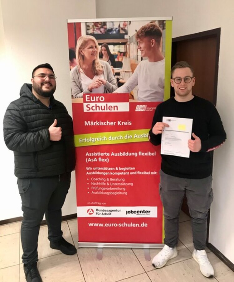 Nicht zuletzt durch die qualifizierte Unterstützung seitens des AsA flex-Teams der Euro-Schulen Westfalen in Werdohl haben unter anderem diese beiden Teilnehmer die Abschlussprüfung zum Industriemechaniker erfolgreich absolviert. Das gesamte Team gratuliert allen Azubis. Gleichzeitig ist dies auch eine Auszeichnung der geleisteten Arbeit, welche im Rahmen der assistierten Ausbildung (AsA flex) von den Ausbildungsbegleiter*innen, Sozialpädagog*innen und Dozenten*innen während des Stütz- und Förderunterrichts geleistet wurde.