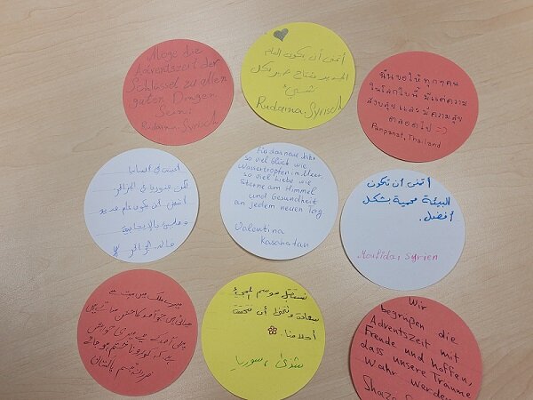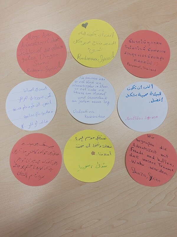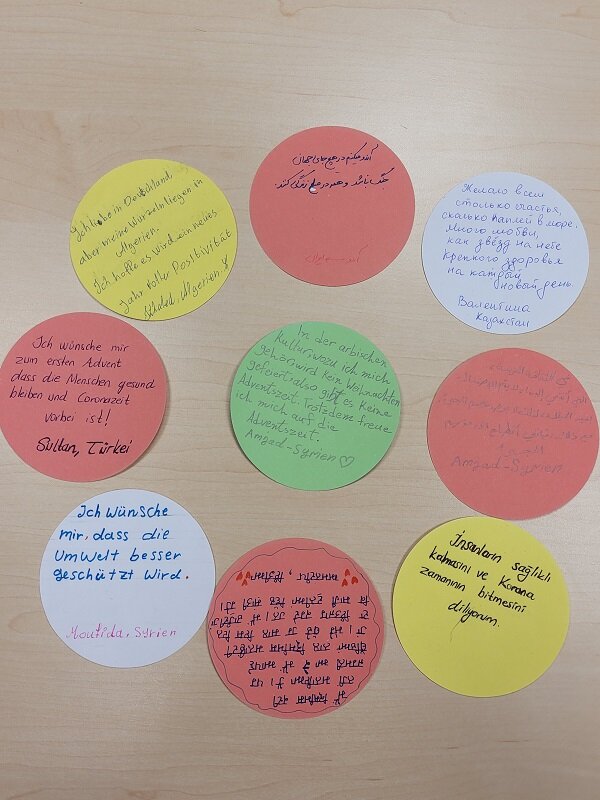 Die Teilnehmer*innen des Berufssprachkurses B2/18 verbinden Weihnachten mit dem Wunsch nach Frieden und Sicherheit. Sehnsucht ist in den Augen zu sehen und sehr bewegt wird über die vielen Erlebnisse in den Heimatländern und den langen Weg nach Deutschland gesprochen. Die Religionen treffen friedlich aufeinander. Unsere Lehrerin Frau Akylbekova hat die Kursteilnehmer*innen gebeten, ihre Gedanken, die in den Bildern zu sehen sind, aufzuschreiben.
