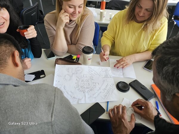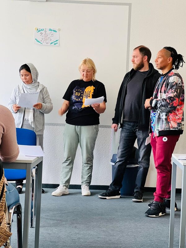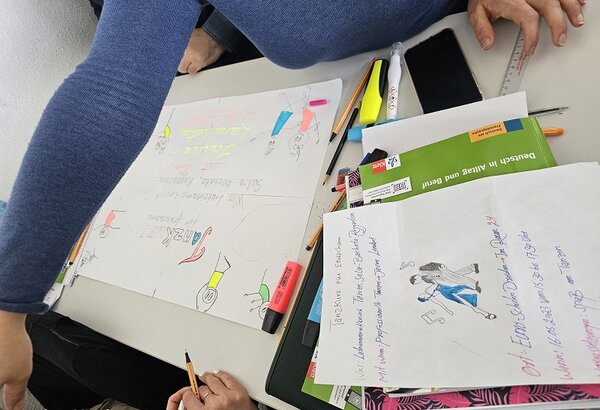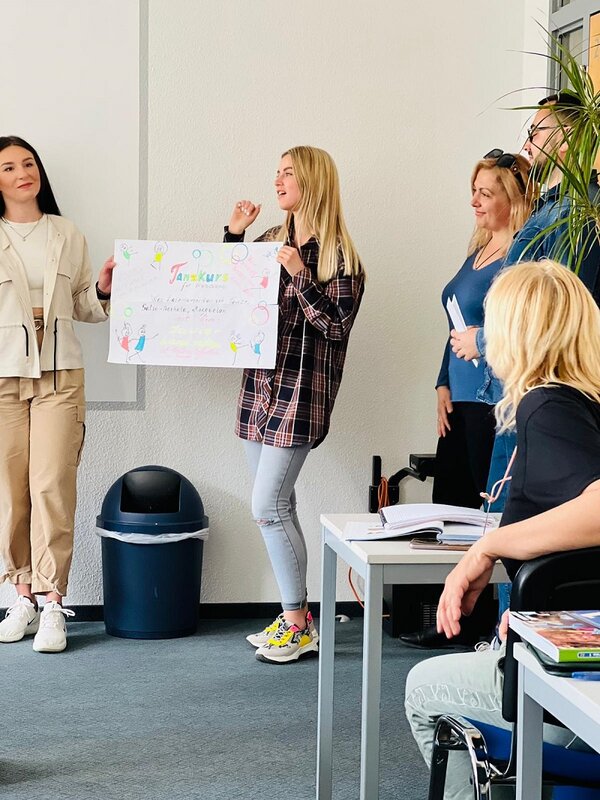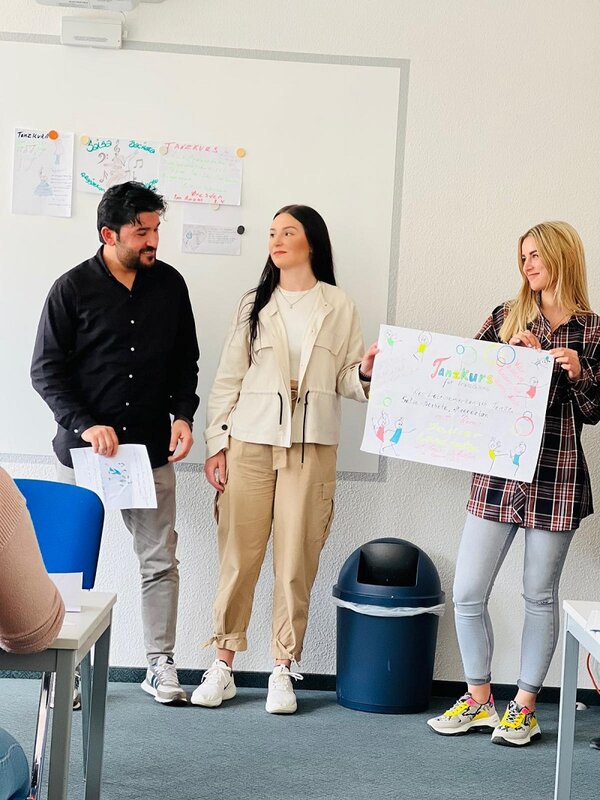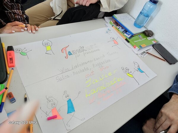 Unsere Teilnehmenden haben mit ihrer Dozentin gemeinsam einen Tanzkurs für lateinamerikanische Tänze organisiert. In Vorbereitung wurden in Gruppenarbeiten verschiedene Plakate entworfen und dann das beste Plakat ausgewählt. Beim Gestalten und Planen des gemeinsamen Projektes wird dabei ganz fleißig Deutsch geübt. Musik soll als Brücke zum Erlernen der neuen Sprache von unseren Teilnehmenden genutzt werden und das funktioniert offenbar richtig gut.