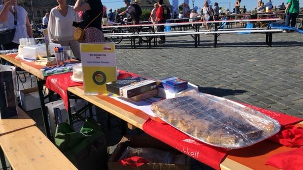 Tausende Besucher*innen strömten in die Innenstadt, um gemeinsam Platz zu nehmen an der längsten Tafel der Stadt. Auf 270 aneinandergereihten Tischen direkt auf Augustusbrücke wurden Speisen aus allen Ländern angeboten. Bei interessanten Gesprächen wurde geschlemmt, gelacht, gemeinsam gespielt, sich unterhalten und ausgelassen getanzt. Auch wir waren mit unserem Team dabei und brachten leckeren selbstgebackenen Kuchen und herzhafte Köstlichkeiten zum gemeinsamen Mahl mit.