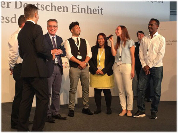 Anlässlich der zentralen Feierlichkeiten zum Tag der Deutschen Einheit in Dresden bekamen fünf Teilnehmer eines Integrationskurses der <link internal-link>Euro-Schulen Dresden ihre Zertifikate vom Bundesminister des Innern Dr. Thomas de Maizière überreicht. Sie hatten erst vor wenigen Tagen ihre Prüfung abgelegt.