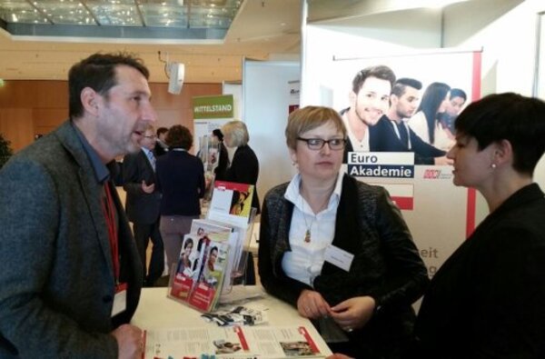 Die Euro-Schulen präsentierten hierbei ihr breit gefächertes Leistungsspektrum von Unternehmensschulungen in den Bereichen Management, Personal und Sprachen bis hin zu Fort- und Weiterbildungen im sozialpädagogischen Gebiet. Am Messestand konnten zahlreiche Gespräche mit Entscheidern aus Wirtschaft, Politik und Wissenschaft sowie mit Fachexperten geführt werden – eine gute Basis weiterführender Kontakte.
