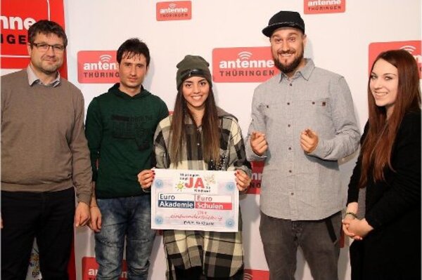 Ein Highlight gab es am nächsten Tag für Ranim aus Syrien, Mohammad aus Afghanistan und Franziska, die an der Euro Akademie Erfurt eine Ausbildung zur Erzieherin absolviert. Zusammen mit dem Leiter der Euro-Schulen Erfurt, Herrn Schöneck, durften sie in das Studio von Antenne Thüringen fahren und den Spendenscheck persönlich abgeben.