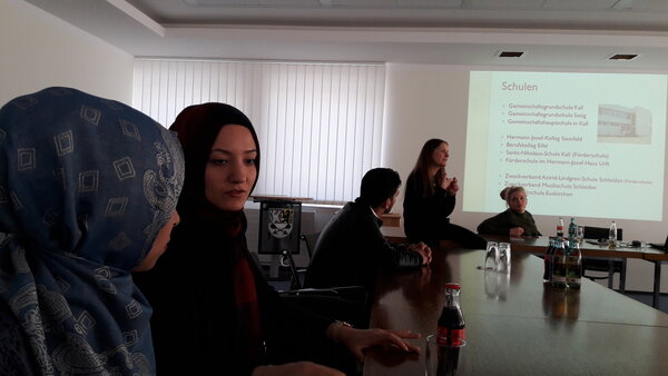 Freundlich wurden die neugierigen Teilnehmer in den Rathaussaal geleitet, wo Herr Heller, stellvertretender Bürgermeister von Kall, die Flüchtlingsbeauftragte der Gemeinde, Frau Gempfer mitsamt Frau Behrend (Bundesfreiwilliigendienstleistende (Bufdi) in der Flüchtlingshilfe Kall), sie empfingen. Diese erzählten von ihren Kontakten zu Asylbewerbern und dem Bestreben der Gemeinde die neuen Bürger herzlichst willkommen zu heißen und ihnen bei allen Problemen und Fragen tatkräftig zur Seite zu stehen.