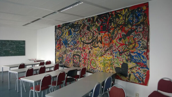 Im Rahmen des derzeitigen ESF-BAMF-Kurses „Deutsch für den Beruf“ gestalteten die Teilnehmer unter Anleitung der Kunstlehrerin, Frau Lomsché-Manchon, und des Deutschlehrers, Herrn Hofmüller, ein überdimensionales farbenfrohes Wandbild.
