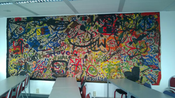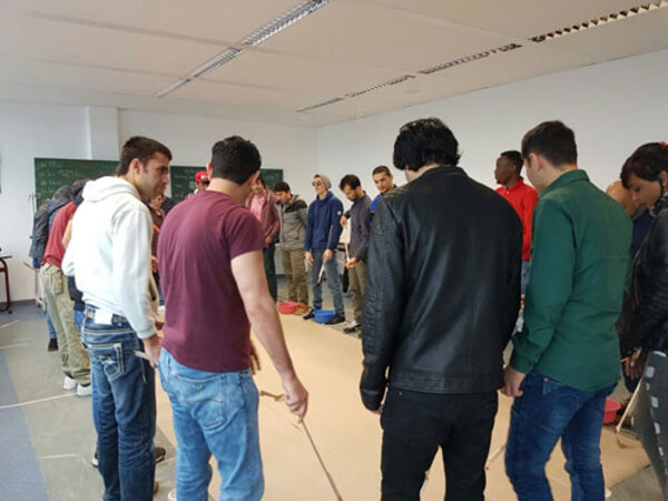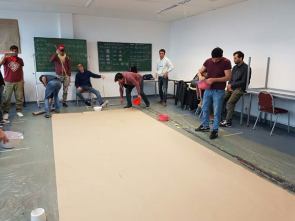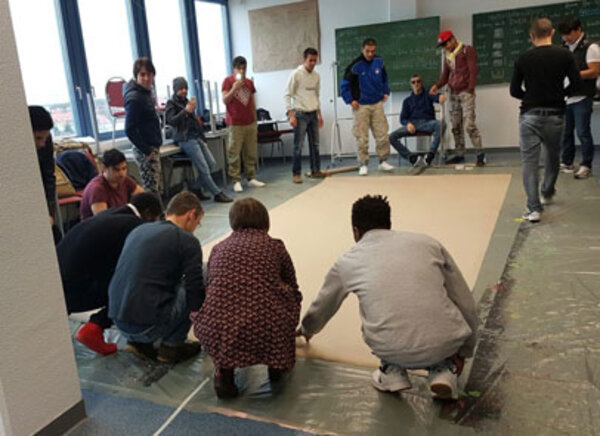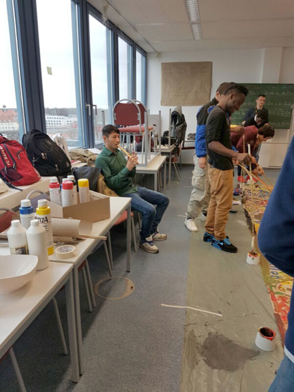 Wieviel Freude die Flüchtlinge, die hauptsächlich aus Afghanistan und einigen afrikanischen Ländern stammen, daran hatten, zeigen die Fotos vom Gestaltungsprozess und natürlich das Endergebnis, welches nun den Klassenraum großflächig ziert.
