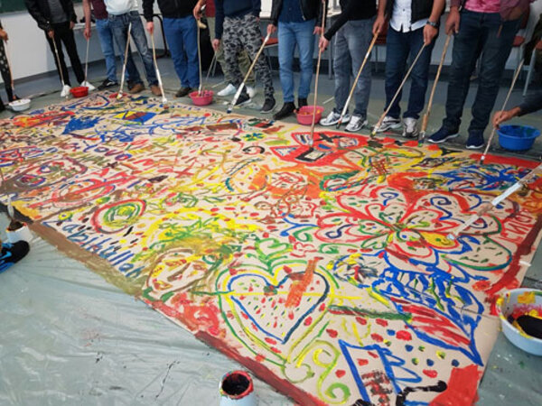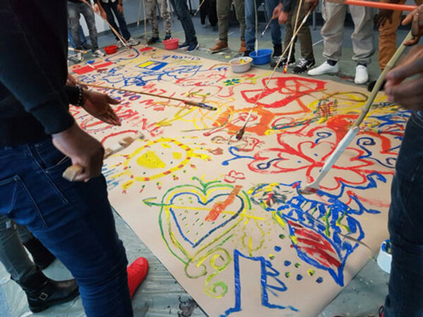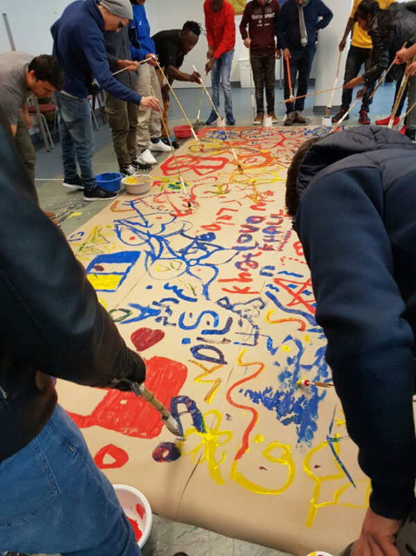 Die Aufgabe bestand darin, unter Verwendung der Grundfarben, der Farbe Schwarz sowie langstieligen Pinseln in einem gemeinsam gestalteten Bild inspiriert von Musik die eigenen Emotionen zum Ausdruck zu bringen. Ein Teilnehmer begleitete die anderen Migranten bei ihrer Arbeit auf seiner Blockflöte mit fremden, melancholischen und zugleich beruhigend klingenden Tönen.