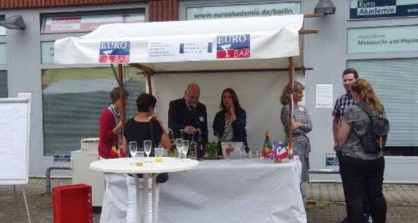 Auch die Eltern kamen nicht zu kurz: Geflügelbratwürste fanden reißenden Absatz. Internationale Spezialitäten boten unter anderem die Euro-Schulen Berlin-Brandenburg an. Neben alkoholfreien Getränken wurden an der Euro Bar des Fachbereichs Management & Internationales Cocktails gemixt. Oder man entschied sich für Cappuccino und Kuchen der Physiotherapeuten und Sozialassistenten.