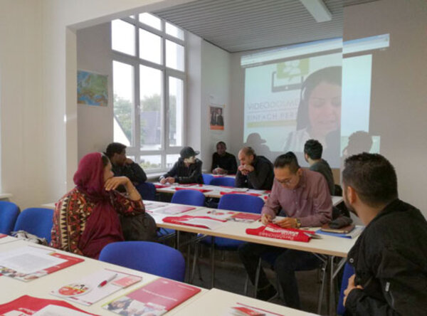Zur Begrüßung und zur Einführung in die Maßnahme trafen sich die Teilnehmer mit den verantwortlichen Dozenten und Sozialpädagogen an den jeweiligen Standorten. Zunächst wurden die Teilnehmer mit allen nötigen Materialien samt kleiner Präsente ausgestattet und anschließend über die KompAS-Maßnahme und den Integrationskurs informiert.