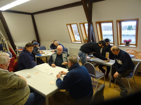 Gemeinsam haben sich die Mitarbeiter mit den Teilnehmern – immerhin 36 AGHler und 24 Asylbewerber – auf Weihnachten eingestimmt. Dabei wurde für das leibliche Wohl gut gesorgt. Bei Weihnachtsmusik standen den Feiernden Kaffee, Tee, Stollen, Plätzchen und Pfefferkuchen zur Verfügung.
