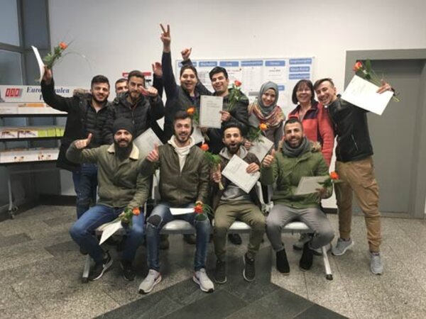 Sie haben allen Grund zur Freude: Fast die gesamte Klasse des vorletzten KompAS-Kurses an den Euro-Schulen Halle hat das Zielniveau B1 erreicht. Das ist nicht nur dem Fleiß der Teilnehmer, sondern auch der engagierten Begleitung durch die Lehrkräfte und den Integrationscoach zu verdanken. Wir gratulieren!