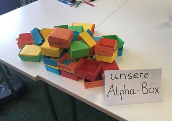 Mit ihrem neuen Alphakurs – einem Integrationskurs mit Alphabetisierung – der am 22. Januar 2018 begonnen hatte, bastelte unsere Dozentin Frau Sartison in der letzten Woche eine sogenannte Alphabox. Darin sollen die Teilnehmenden im Laufe des Kurses Buchstaben sammeln. Die eigenhändige Herstellung von Unterrichtsmaterialien machte allen viel Spaß!