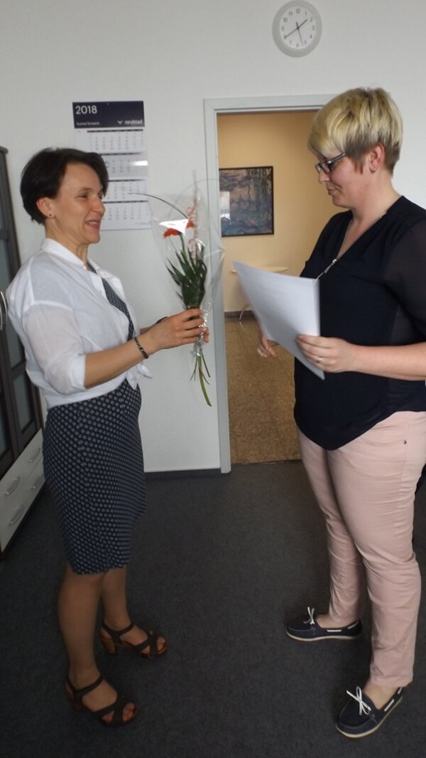 In einer kleinen Feierstunde sind die Ergebnisse der Weiterbildung von der Produktmanagerin Liane Michaelis gewürdigt worden. "Wir zeigen Ihnen damit unsere Wertschätzung gegenüber Ihrem persönlichen Engagement und Ihrer Bereitschaft für lebenslanges Lernen, denn wertgeschätzte, geförderte Mitarbeiter mit aktuellem Wissen zählen zu den wichtigsten Ressourcen unserer Zukunft."