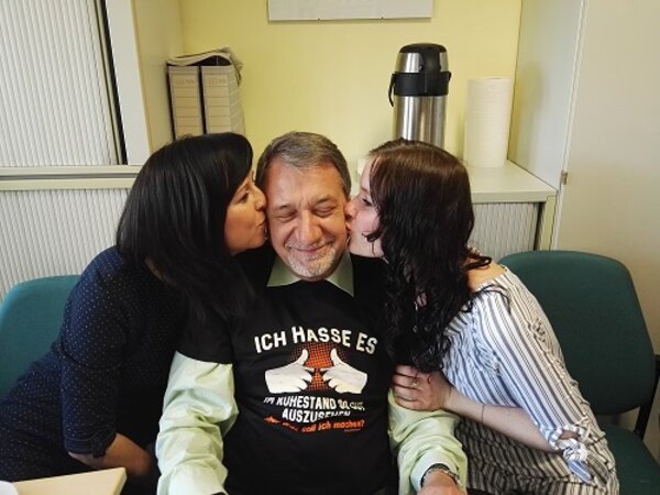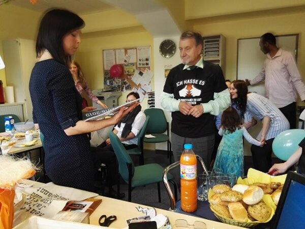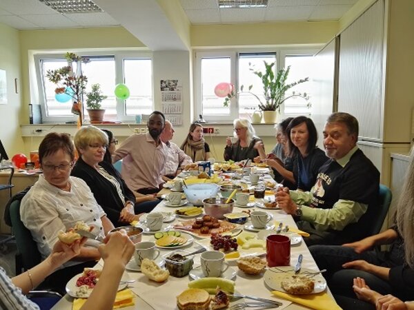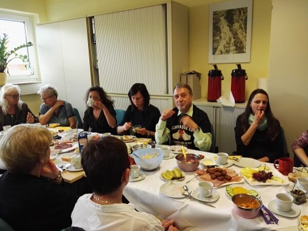 In einer gemütlichen Runde tauschten wir bei einem Frühstück Anekdoten aus dem Arbeitsleben unseres Kollegen aus und wurde beim selbstgedichteten Abschiedslied so manche Träne vergossen.