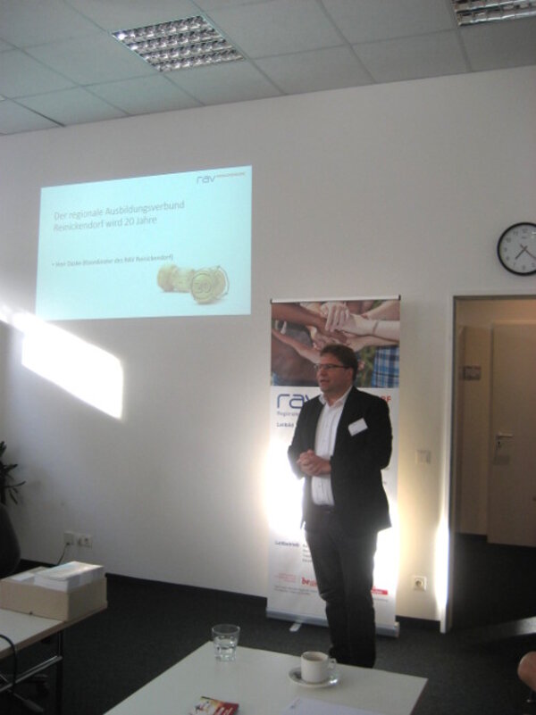 Kilian Daske, Netzwerkkoordinator und Regionalleiter der Euro-Schulen Berlin Brandenburg, lud die Gäste anschließend ein, das zwanzigjährige Bestehen des RAV Reinickendorf bei Umtrunk und mit kleinem Buffet zu feiern. Er freute sich, mit vielen Netzwerkpartnern dieses besondere Jubiläum begehen zu können. Das Netzwerk habe sich stets entsprechend der neuen Herausforderungen orientiert und neu ausgerichtet. Ging es am Anfang um die Schaffung von Ausbildungsplätzen vor dem Hintergrund Konjunkturkrise und hoher Jugendarbeitslosigkeit, müssen heute die Unternehmen dabei unterstützt werden, Jugendliche für ihre Ausbildungsangebote zu begeistern.
