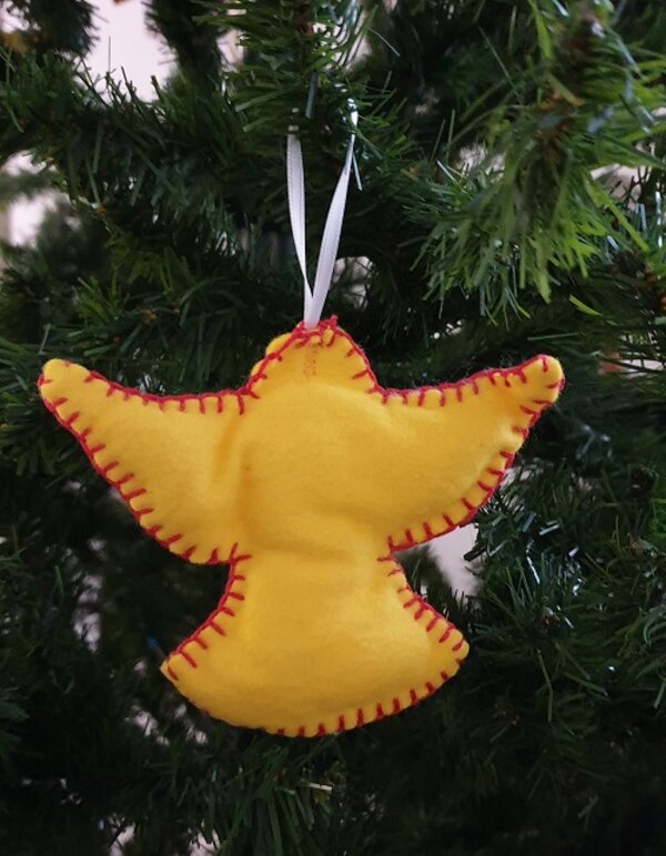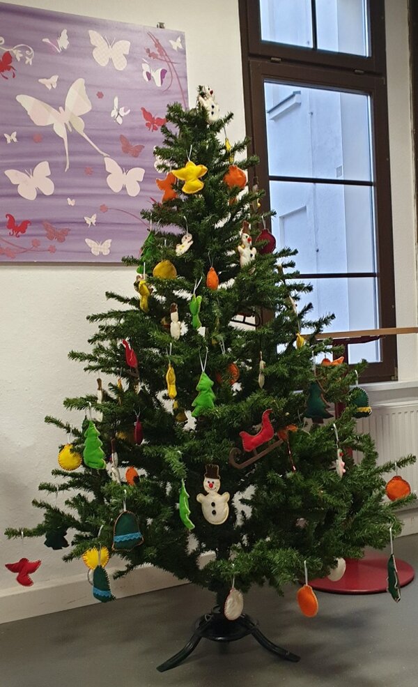 Für den Weihnachtsbaum in der Cafeteria unserer Schule nähten die teilnehmenden Männer der AGH Neubeginn neue, farbenfrohe Anhänger.