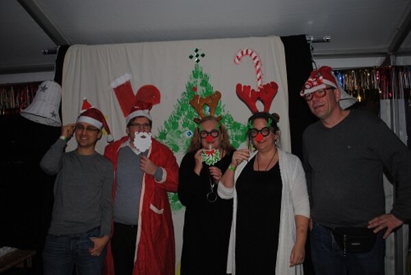 Wer sich gerne verewigen wollte – dabei aber nicht unbedingt erkannt werden wollte, der konnte sich vor einer Fotowand in weihnachtlicher Verkleidung fotografieren lassen. Die Fotowand ist von Erzieher*innen mit tatkräftiger Unterstützung der kreativen Kinder der KITA Waldräuber kreiert worden. Je später der Abend, desto lustiger wurden die Bilder und desto größer wurde der Spaß daran.
