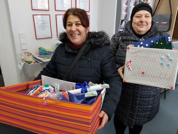 Am Freitag, den 6. Dezember 2019 waren die Frauen dann als „Nikolaus“ unterwegs und überraschten mit den Paketen die Kinder der AWO Kita „Am Schlosspark“, des evangelischen Kindergartens Herzogin Amalie und des Kinderheims „Sonnenland“ sowie die Senior*innen der „Tagespflege im Dichterviertel“. In den Päckchen befanden sich Jahreskalender, Nikolauskalender, Fingerpuppen, Handarbeiten und selbstgebackene Plätzchen.