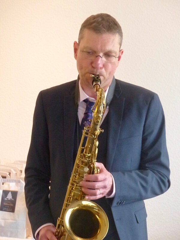Das eigene Talent mit anderen zu teilen, ist ebenfalls ein großes Geschenk. Oliver Baro begleitete die Feier musikalisch und begeisterte die Kollegen*innen durch sein Saxophonspiel sowie seine geschmackvolle Musikauswahl. Und die Cafeteria-Betreiber Mesut und Meyrem zauberten ein tolles Büfett.