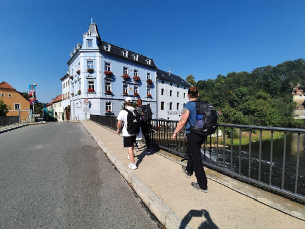 Gegen 9 Uhr wurden wir an den Euro-Schulen mit dem Auto abgeholt und ins rund 50 Kilometer entfernte Drehsa gefahren. Dann ging es richtig los. Von hier an hieß unser erstes Ziel „Schmochtitz“. Der Weg führte uns auf dem ökumenischen Pilgerweg durch Bautzen, über Felder und Berge zu unserer ersten Herberge. 22 Kilometer später waren wir endlich am Ziel: im Bischof-Benno-Haus. Die Unterkunft wirkte sehr luxuriös und unsere Zimmer gefielen uns besonders gut. Endlich konnte sich jeder etwas zurückziehen und Kraft für die morgige Tour tanken. Am Abend ließen wir zusammen mit Frau Tauchmann und Frau Niemz den Tag mit leckerem Essen vom Buffet und guten Getränken ausklingen.