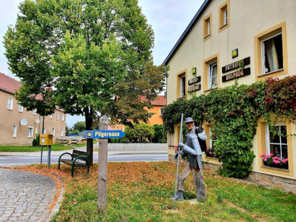 Der Weg kam uns unendlich lang vor, denn wir liefen heute fast ausschließlich an der Straße entlang. In Crostwitz legten wir einen kurzen Zwischenstopp bei einer Pilgeroase ein. Hier gab es Kaffee und leckeren Kuchen. Gestärkt und wieder etwas besser gelaunt machten wir uns auf den Weg, der noch vor uns lag.