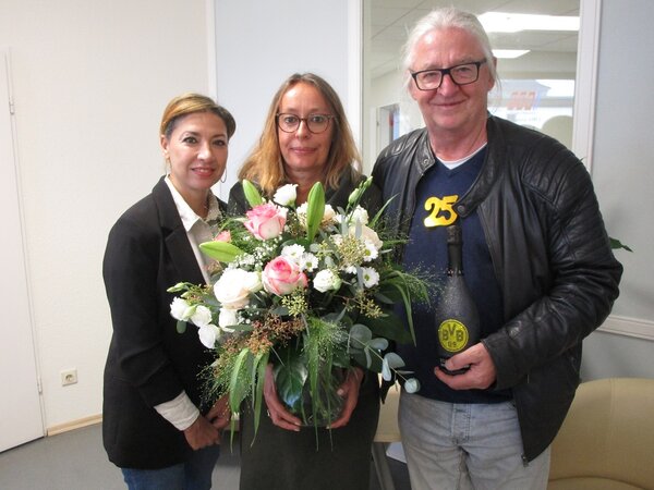 Schon während ihres Studiums arbeitete Frau Fischer als Honorarkraft bei den Euro-Schulen und erhielt nach erfolgreichem Abschluss ihres Studiums im Jahre 1997 einen Arbeitsvertrag als Dozentin für den Bereich „Deutsch als Fremdsprache“. Die individuelle Betreuung der Teilnehmenden war ihr bei der Arbeit immer eine Herzensangelegenheit, so verlagerte sich ihr Aufgabenschwerpunkt in den Folgejahren mehr und mehr in den sozialpädagogischen Bereich. Frau Fischer leitet nun das Team des Förderzentrums. Wie beliebt sie in ihrem Team ist, haben die Kolleg*innen an ihrem Jubiläumstag deutlich zum Ausdruck gebracht.
