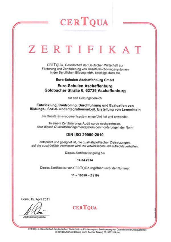 Auch CERTQUA Geschäftsführer Diplom-Soziologe Andreas Orru bestätigt dies: „Wie bereits bei den Regelwerken nach ISO 9001 und AZWV, so ist ESO auch bei den neuen internationalen Qualitätsstandards in der Bildung traditionell in vorderster Reihe bei der Umsetzung von Qualitätsstandards erfolgreich. Die Mitglieder der Euro-Schulen-Organisation haben in den Jahren der Zusammenarbeit mit CERTQUA nicht nachgelassen in dem Streben, Qualität zu sichern und zu verbessern. Dieses erfolgreiche Streben kommt zum Ausdruck – nicht nur in den wiederholten Rezertifizierungen nach ISO 9001 und AZWV – sondern auch in der Erstzertifizierung nach ISO 29990. Als Geschäftsführer von CERTQUA, der Zertifizierungsgesellschaft der Spitzenverbände der Deutschen Wirtschaft, ist es mir eine Freude, den Mitgliedern von ESO das Zertifikat nach DIN ISO 29990 mit der Nr. 1 ausstellen zu können. Das gesamte Team der CERTQUA wünscht ESO für ihre ziel- und kundenorientierte Bildungs-, Sozial und Integrationsarbeit auch in Zukunft alles Gute.“