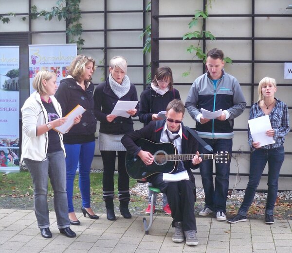 Am 22.09.2012 begleiteten einige Schülerinnen und Schüler der Erzieherklassen E 10 den Tag der offenen Tür im "Kinderhospiz Bärenherz" in Markkleeberg. Musikalisch umrahmten sie den Tag mit selbstkomponierten Songs und Kinderliedern. Da der Tag unter dem Motto „Musik“ stand, hatten Geschwisterkinder und Gäste zudem die Möglichkeit kleine Instrumente aus Haushaltsgegenständen, wie Cremedosen, Papierrollen und Draht, zu basteln. Unsere zukünftigen Erzieherinnen und Erzieher standen ihnen dabei helfend zur Seite. Ein gelungener Tag, der hoffentlich auch den Bewohnern des Hospiz ein bisschen Freude gebracht hat.