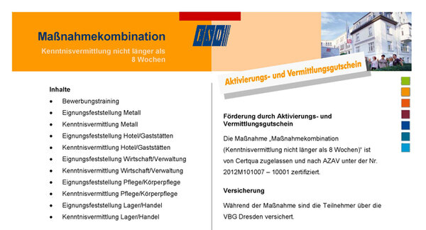 Eine von der Agentur für Arbeit über den Aktivierungs- und Vermittlungsgutschein (AVGS) geförderte "Maßnahmekombination (Kenntnisvermittlung nicht länger als 8 Wochen)" bieten die Euro-Schulen Altenburg ab sofort an. Die einzelnen Kursbausteine richten sich an Personen, die eine Beschäftigung suchen. Sie beinhalten Bewerbungstraining, Eignungsfeststellung und Kenntnisvermittlung in den Bereichen Metall, Hotel/Gaststätten, Wirtschaft/Verwaltung, Pflege/Körperpflege sowie Lager/Handel.