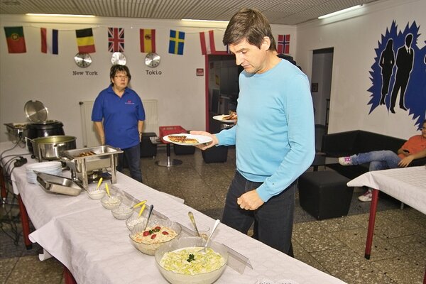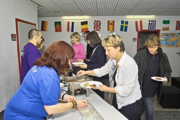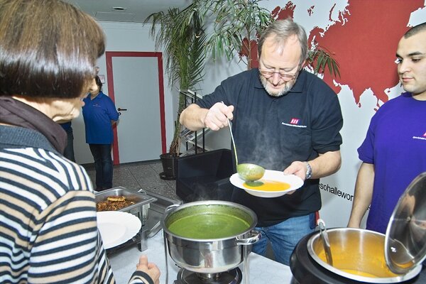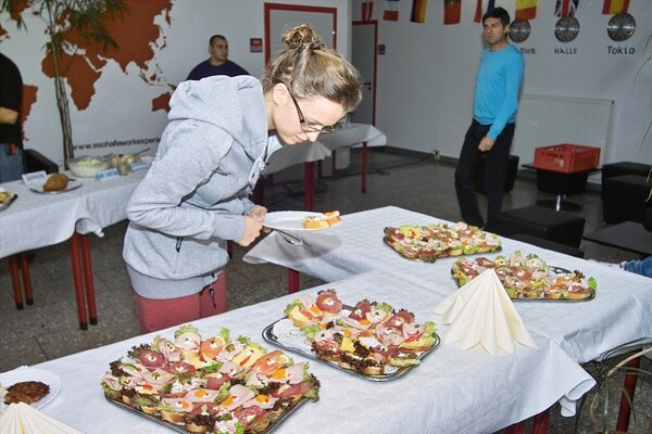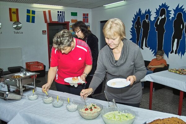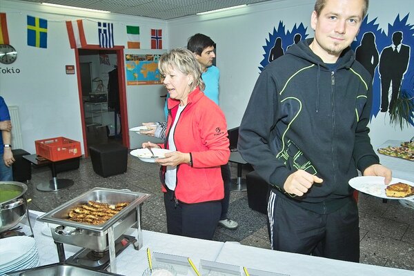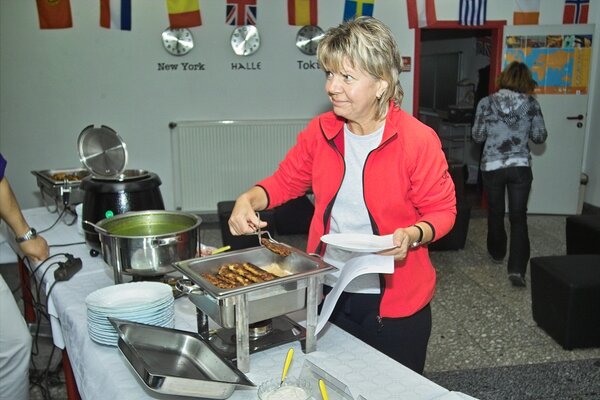 Zur Stärkung von Körper und Geist richtete der Bereich Sozialassistenz ein leckeres gesundes Buffet an. Neben verschiedensten Salaten, Canapés, Zucchini-Kuchen und Obst gab es sehr gut schmeckende Gemüsebratlinge, leckere Möhrencreme- und Spinatsuppe. Es wurde mit großem Appetit gegessen. Lobende Worte für die Köche und der Griff vieler Teilnehmer zu den ausgelegten Rezepturen war Beweis dafür, dass eine gesunde Ernährung auch sehr schmackhaft sein und mit wenig Aufwand zubereitet werden kann.